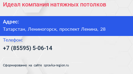 Идеал, компания натяжных потолков по адресу Татарстан, Лениногорск, проспект Ленина, 28 в дальнейшем Организация, размещена в следующих категориях: