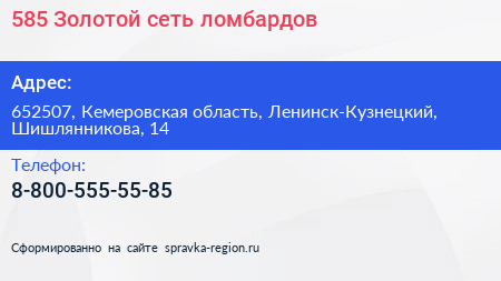 585*Золотой, сеть ломбардов по адресу 652507, Кемеровская область, Ленинск-Кузнецкий, Шишлянникова, 14 в дальнейшем Организация, размещена в следующих категориях: