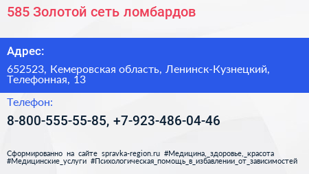 585*Золотой, сеть ломбардов по адресу 652523, Кемеровская область, Ленинск-Кузнецкий, Телефонная, 13 в дальнейшем Организация, размещена в следующих категориях: