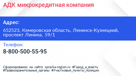 АДК, микрокредитная компания по адресу 652523, Кемеровская область, Ленинск-Кузнецкий, проспект Ленина, 59/1 в дальнейшем Организация, размещена в следующих категориях: