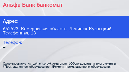 Альфа-Банк, банкомат по адресу 652523, Кемеровская область, Ленинск-Кузнецкий, Телефонная, 13 в дальнейшем Организация, размещена в следующих категориях: