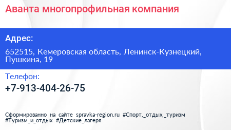 Аванта, многопрофильная компания по адресу 652515, Кемеровская область, Ленинск-Кузнецкий, Пушкина, 19 в дальнейшем Организация, размещена в следующих категориях: