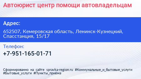 Автоюрист, центр помощи автовладельцам по адресу 652507, Кемеровская область, Ленинск-Кузнецкий, Спасстанция, 15/17 в дальнейшем Организация, размещена в следующих категориях: