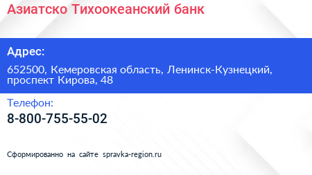 Азиатско-Тихоокеанский банк по адресу 652500, Кемеровская область, Ленинск-Кузнецкий, проспект Кирова, 48 в дальнейшем Организация, размещена в следующих категориях: