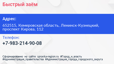 Быстрый заём по адресу 652515, Кемеровская область, Ленинск-Кузнецкий, проспект Кирова, 112 в дальнейшем Организация, размещена в следующих категориях: