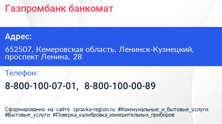 Газпромбанк, банкомат по адресу 652507, Кемеровская область, Ленинск-Кузнецкий, проспект Ленина, 28 в дальнейшем Организация, размещена в следующих категориях: