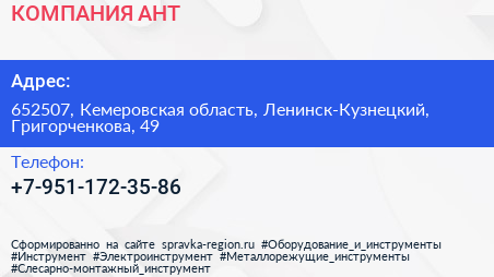 КОМПАНИЯ АНТ по адресу 652507, Кемеровская область, Ленинск-Кузнецкий, Григорченкова, 49 в дальнейшем Организация, размещена в следующих категориях: