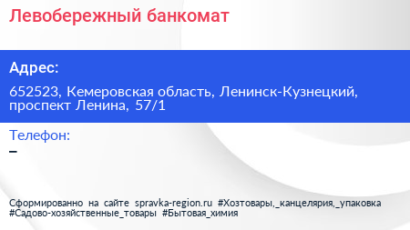 Левобережный, банкомат по адресу 652523, Кемеровская область, Ленинск-Кузнецкий, проспект Ленина, 57/1 в дальнейшем Организация, размещена в следующих категориях: