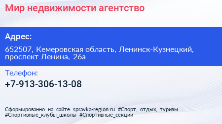 Мир недвижимости, агентство по адресу 652507, Кемеровская область, Ленинск-Кузнецкий, проспект Ленина, 26а в дальнейшем Организация, размещена в следующих категориях: