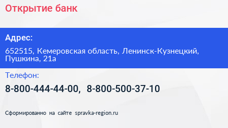 Открытие, банк по адресу 652515, Кемеровская область, Ленинск-Кузнецкий, Пушкина, 21а в дальнейшем Организация, размещена в следующих категориях: