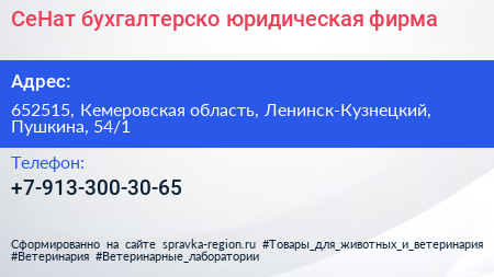 СеНат, бухгалтерско-юридическая фирма по адресу 652515, Кемеровская область, Ленинск-Кузнецкий, Пушкина, 54/1 в дальнейшем Организация, размещена в следующих категориях: