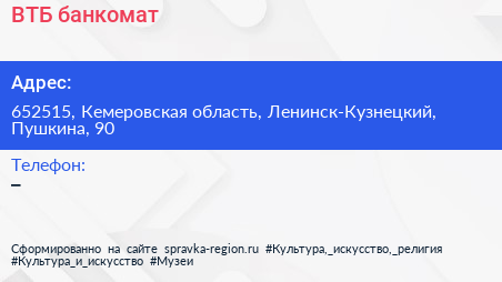 ВТБ, банкомат по адресу 652515, Кемеровская область, Ленинск-Кузнецкий, Пушкина, 90 в дальнейшем Организация, размещена в следующих категориях: