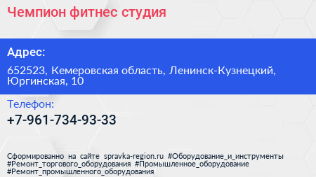 Чемпион, фитнес-студия по адресу 652523, Кемеровская область, Ленинск-Кузнецкий, Юргинская, 10 в дальнейшем Организация, размещена в следующих категориях: