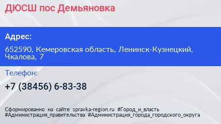 ДЮСШ, пос. Демьяновка по адресу 652590, Кемеровская область, Ленинск-Кузнецкий, Чкалова, 7 в дальнейшем Организация, размещена в следующих категориях: