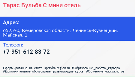 Тарас Бульба`C, мини-отель по адресу 652590, Кемеровская область, Ленинск-Кузнецкий, Майская, 1 в дальнейшем Организация, размещена в следующих категориях: