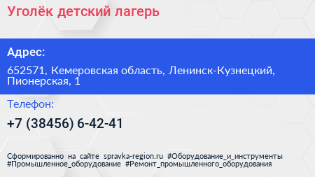 Уголёк, детский лагерь по адресу 652571, Кемеровская область, Ленинск-Кузнецкий, Пионерская, 1 в дальнейшем Организация, размещена в следующих категориях: