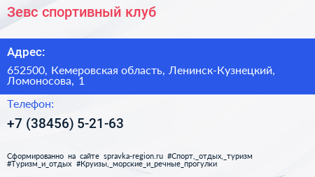 Зевс, спортивный клуб по адресу 652500, Кемеровская область, Ленинск-Кузнецкий, Ломоносова, 1 в дальнейшем Организация, размещена в следующих категориях: