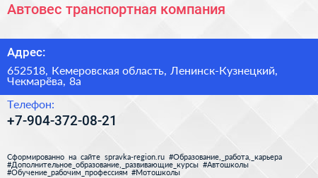 Автовес, транспортная компания по адресу 652518, Кемеровская область, Ленинск-Кузнецкий, Чекмарёва, 8а в дальнейшем Организация, размещена в следующих категориях: