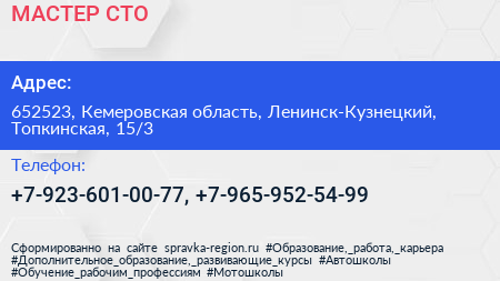 МАСТЕР, СТО по адресу 652523, Кемеровская область, Ленинск-Кузнецкий, Топкинская, 15/3 в дальнейшем Организация, размещена в следующих категориях: