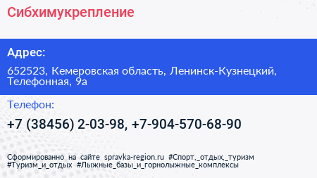 Сибхимукрепление по адресу 652523, Кемеровская область, Ленинск-Кузнецкий, Телефонная, 9а в дальнейшем Организация, размещена в следующих категориях: