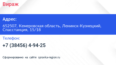 Вираж по адресу 652507, Кемеровская область, Ленинск-Кузнецкий, Спасстанция, 15/18 в дальнейшем Организация, размещена в следующих категориях: