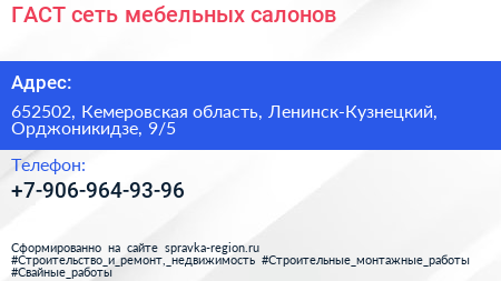 ГАСТ, сеть мебельных салонов по адресу 652502, Кемеровская область, Ленинск-Кузнецкий, Орджоникидзе, 9/5 в дальнейшем Организация, размещена в следующих категориях: