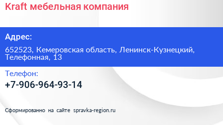 Kraft, мебельная компания по адресу 652523, Кемеровская область, Ленинск-Кузнецкий, Телефонная, 13 в дальнейшем Организация, размещена в следующих категориях: