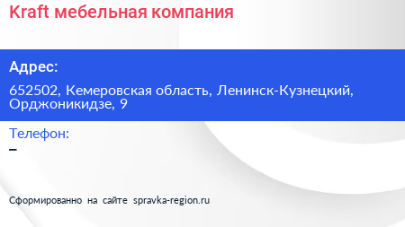 Kraft, мебельная компания по адресу 652502, Кемеровская область, Ленинск-Кузнецкий, Орджоникидзе, 9 в дальнейшем Организация, размещена в следующих категориях: