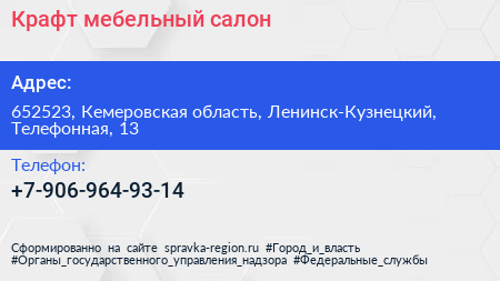 Крафт, мебельный салон по адресу 652523, Кемеровская область, Ленинск-Кузнецкий, Телефонная, 13 в дальнейшем Организация, размещена в следующих категориях: