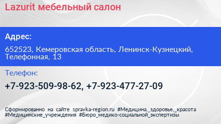 Lazurit, мебельный салон по адресу 652523, Кемеровская область, Ленинск-Кузнецкий, Телефонная, 13 в дальнейшем Организация, размещена в следующих категориях: