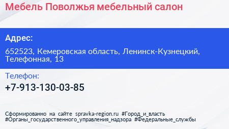 Мебель Поволжья, мебельный салон по адресу 652523, Кемеровская область, Ленинск-Кузнецкий, Телефонная, 13 в дальнейшем Организация, размещена в следующих категориях: