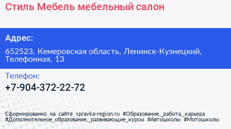 Стиль Мебель, мебельный салон по адресу 652523, Кемеровская область, Ленинск-Кузнецкий, Телефонная, 13 в дальнейшем Организация, размещена в следующих категориях: