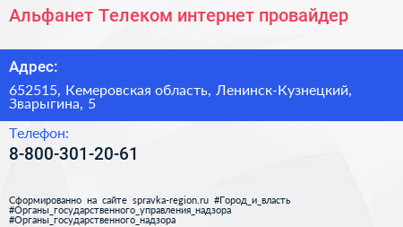 Альфанет Телеком, интернет-провайдер по адресу 652515, Кемеровская область, Ленинск-Кузнецкий, Зварыгина, 5 в дальнейшем Организация, размещена в следующих категориях: