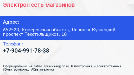 Электрон, сеть магазинов по адресу 652523, Кемеровская область, Ленинск-Кузнецкий, проспект Текстильщиков, 18 в дальнейшем Организация, размещена в следующих категориях: