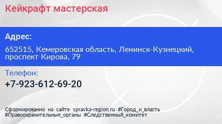 Кейкрафт, мастерская по адресу 652515, Кемеровская область, Ленинск-Кузнецкий, проспект Кирова, 79 в дальнейшем Организация, размещена в следующих категориях: