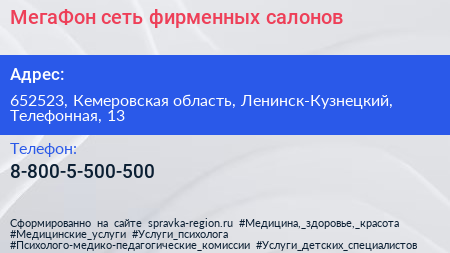 МегаФон, сеть фирменных салонов по адресу 652523, Кемеровская область, Ленинск-Кузнецкий, Телефонная, 13 в дальнейшем Организация, размещена в следующих категориях: