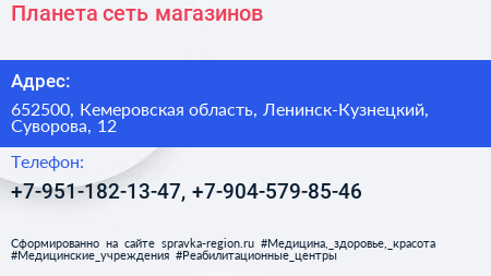 Планета, сеть магазинов по адресу 652500, Кемеровская область, Ленинск-Кузнецкий, Суворова, 12 в дальнейшем Организация, размещена в следующих категориях: