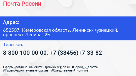 Почта России по адресу 652507, Кемеровская область, Ленинск-Кузнецкий, проспект Ленина, 2Б в дальнейшем Организация, размещена в следующих категориях: