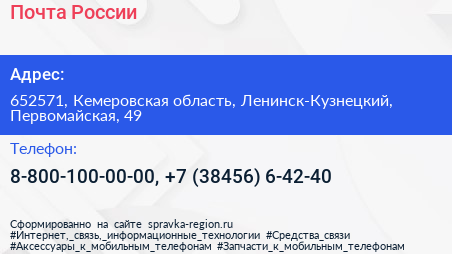 Почта России по адресу 652571, Кемеровская область, Ленинск-Кузнецкий, Первомайская, 49 в дальнейшем Организация, размещена в следующих категориях: