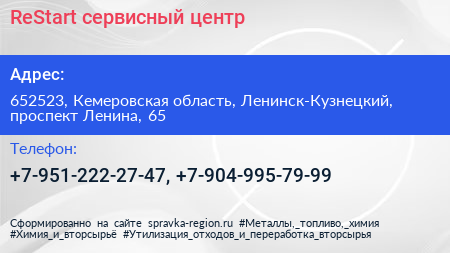 ReStart, сервисный центр по адресу 652523, Кемеровская область, Ленинск-Кузнецкий, проспект Ленина, 65 в дальнейшем Организация, размещена в следующих категориях:
