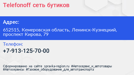 Telefonoff, сеть бутиков по адресу 652515, Кемеровская область, Ленинск-Кузнецкий, проспект Кирова, 79 в дальнейшем Организация, размещена в следующих категориях: