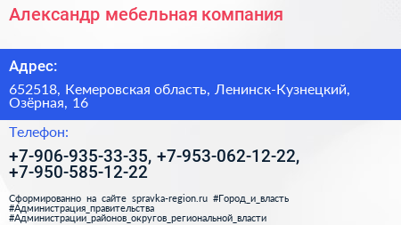 Александр, мебельная компания по адресу 652518, Кемеровская область, Ленинск-Кузнецкий, Озёрная, 16 в дальнейшем Организация, размещена в следующих категориях:
