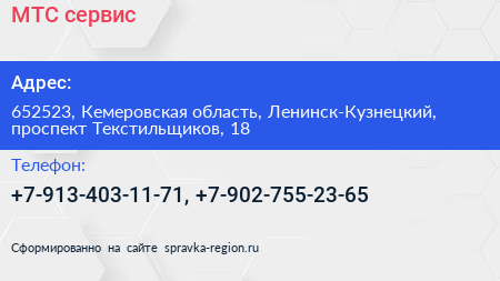 МТС- сервис по адресу 652523, Кемеровская область, Ленинск-Кузнецкий, проспект Текстильщиков, 18 в дальнейшем Организация, размещена в следующих категориях: