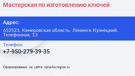 Мастерская по изготовлению ключей по адресу 652523, Кемеровская область, Ленинск-Кузнецкий, Телефонная, 13 в дальнейшем Организация, размещена в следующих категориях: