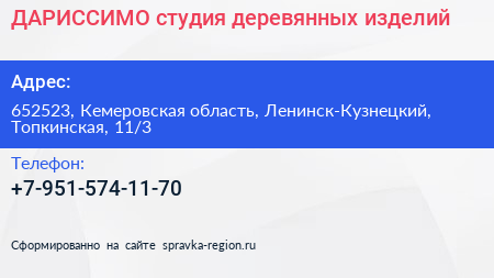 ДАРИССИМО, студия деревянных изделий по адресу 652523, Кемеровская область, Ленинск-Кузнецкий, Топкинская, 11/3 в дальнейшем Организация, размещена в следующих категориях: