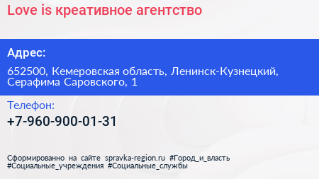 Love is, креативное агентство по адресу 652500, Кемеровская область, Ленинск-Кузнецкий, Серафима Саровского, 1 в дальнейшем Организация, размещена в следующих категориях: