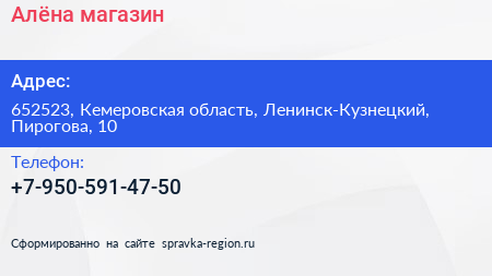Алёна, магазин по адресу 652523, Кемеровская область, Ленинск-Кузнецкий, Пирогова, 10 в дальнейшем Организация, размещена в следующих категориях: