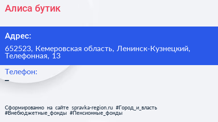 Алиса, бутик по адресу 652523, Кемеровская область, Ленинск-Кузнецкий, Телефонная, 13 в дальнейшем Организация, размещена в следующих категориях: