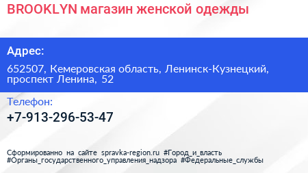BROOKLYN, магазин женской одежды по адресу 652507, Кемеровская область, Ленинск-Кузнецкий, проспект Ленина, 52 в дальнейшем Организация, размещена в следующих категориях:
