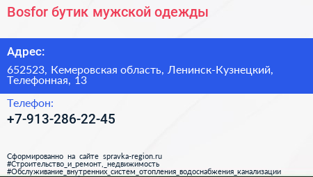 Bosfor, бутик мужской одежды по адресу 652523, Кемеровская область, Ленинск-Кузнецкий, Телефонная, 13 в дальнейшем Организация, размещена в следующих категориях: